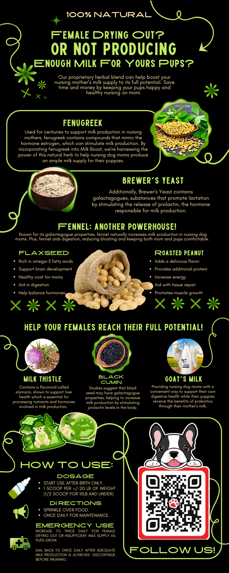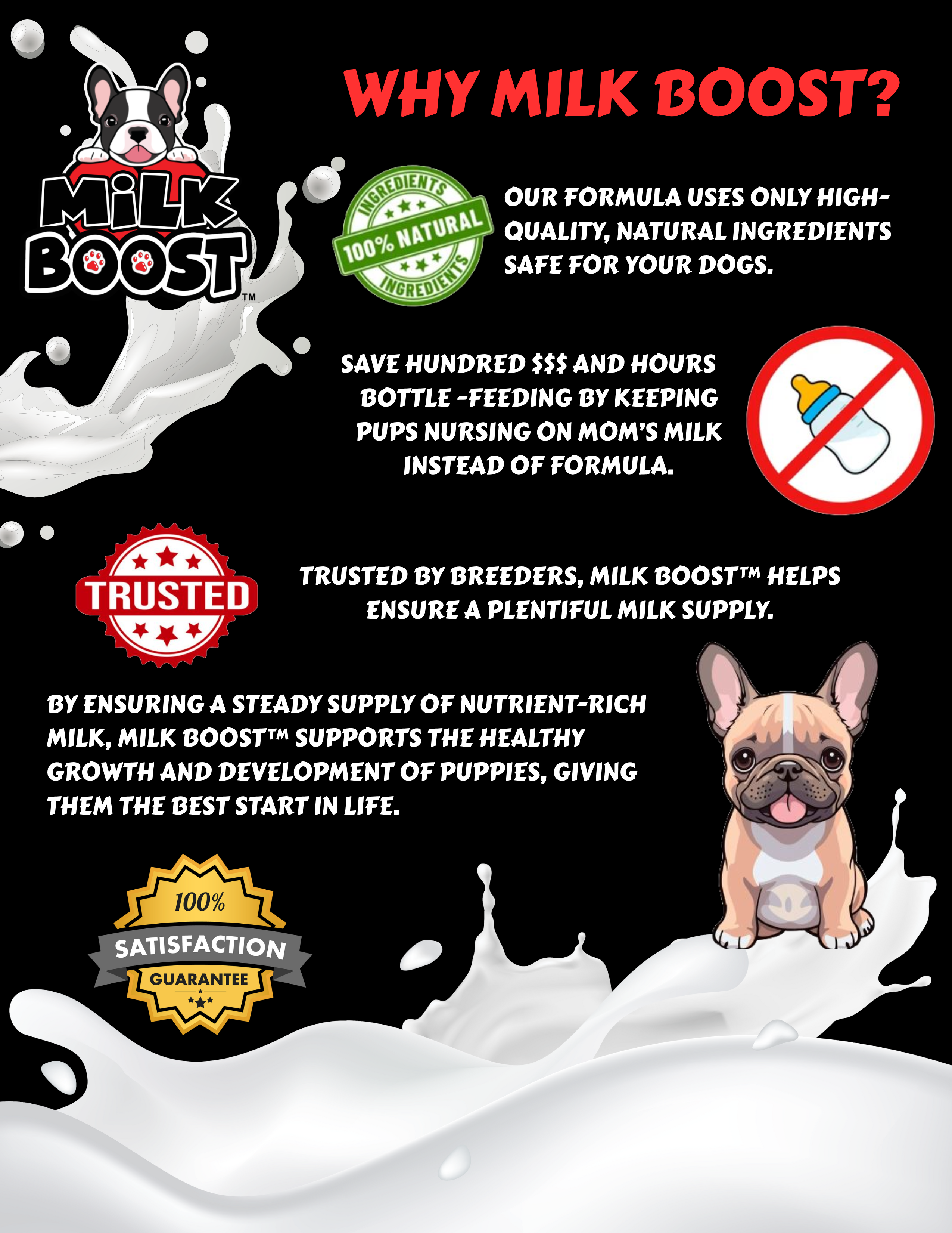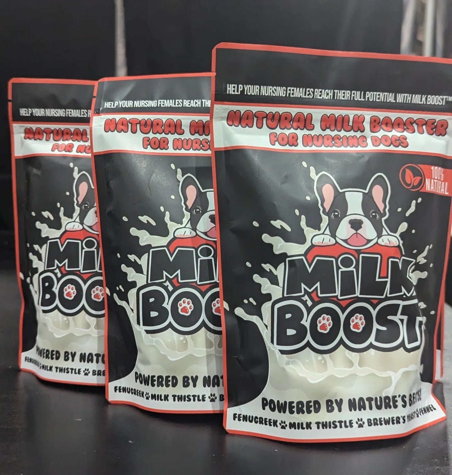 A nursing female running dry or low on milk can be life threatening for pups and a costly and time consuming ordeal for breeders. Milk Boost™ is here to save the day! The ultimate natural supplement designed to enhance milk production in nursing dog moms, Milk Boost™ is crafted with powerful, all-natural ingredients like fenugreek, fennel, and milk thistle to ensures there's plenty of nutritious milk for your growing puppies. Trusted by professional and home-based dog breeders, our formula supports overall health, promotes healthy puppy development, and makes feeding time enjoyable with its delicious peanut butter flavor. Discover the benefits of Milk Boost™ and give your nursing dogs the support they need for a healthy, happy litter. Don't get caught without it!